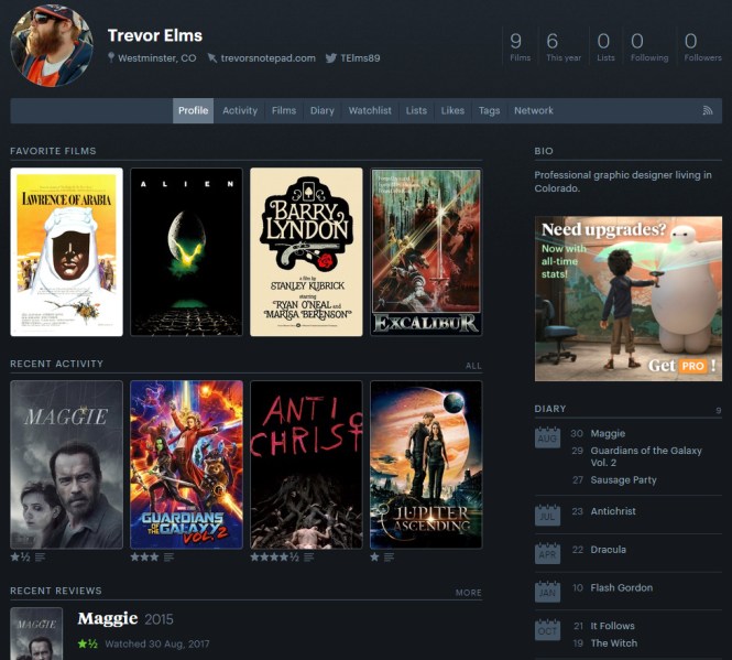 Megan and I often watch a new movie together every day so the profile will be updated regularly with films I watch or re-watch. This is a way for me to keep myself motivated about writing without bogging my site down with things like movie reviews.